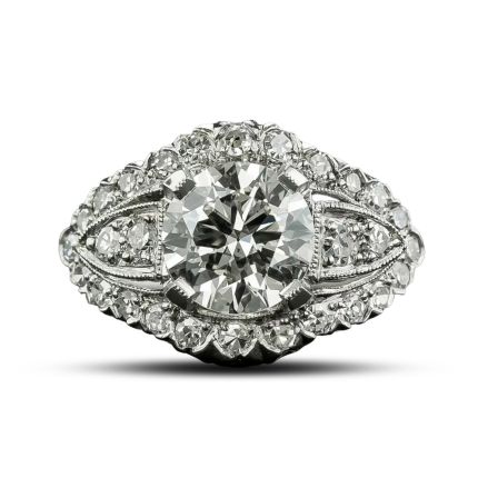 Dating back to the fabulous 1940s-50s, this spectacular vintage sparkler, hand fabricated in platinum, features a beautiful bright and shining transitional European-cut/round brilliant-cut diamond, weighing 1.16 carats. The scintillating stone centers a gently curved mounting between pierced shield-shape diamond-set shoulders framed all around with small glittering single-cut diamonds. Classic fishtail settings adorn the side gallery of this dynamic dazzler. Accompanied by a GIA Diamond Grading Report stating: J color - SI2 clarity (based upon colorless transparent inclusions). Currently ring size 4 3/4.