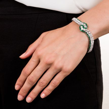 Masterfully hand fabricated in platinum, circa the 1950s-60s, this supple and slinky, lithe and lustrous ultra-sparkler is artfully composed of a pair of interlocking mirror-image serpentine sections sparkling with 12.60 carats of fine icy-white round brilliant cut diamonds bordered with gemmy bright green round faceted emeralds. The centerpiece features a half-dozen round brilliants which alone total 1.60 carats, while a single marquise diamond adorns the clasp. A singular, stunning, and impressive mid-20th century showstopper evocative of the fabulous jewels of Golden Age Hollywood. This sensational wrist bauble measures just over 6 1/2 inches. Total diamond weight, 12.75 carats; total emerald weight, 3.00 carats.