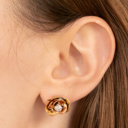 Inspired by nature, these ravishing, multidimensional, Mid-Century earrings, intricately fashioned as rose blossoms, are sturdily rendered in 18K rose gold and sparkle brightly at their centers with lively round brilliant-cut diamonds. Like little corsages for your ears. Total diamond weight, .55 carat. Crafted in 18K rose and platinum (diamond settings).