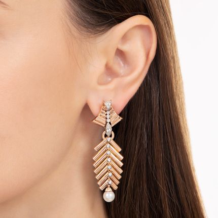 The ingenuity in the design of these fabulous Retro earrings (circa 1940s) is part of their allure. The distinctive dangles (and angles), composed of multiple articulated tube-like chevron shapes--each shimmering with a bezel-set single-cut diamond--take the form of highly stylized, geometric feathers, each lithely swinging back and forth beneath complementary tops accented with single cuts. Adding contrast and a lovely luster are two gleaming cultured pearls. No need for a feather in your cap when you can have two on your ears. Total diamond weight, .65 carat. Hand fabricated in 18K gold, diamonds set in platinum.