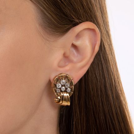 With characteristic boldness and bling, these earrings of the 1940s Retro period dazzle with clusters of bright old mine-cut diamonds that center radiating 'ribbons' of gleaming gold, while sculpted scrolls add dynamic dimension below. Total diamond weight, 2.00 carats. Hand fabricated in 18K gold, diamonds are set in white gold.