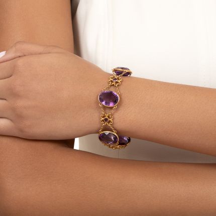 Wearable jubilance. That's what you have with this bold and bright Victorian bracelet. Five large oval amethysts, imbued with a luscious deep purple hue, connect via chains centered by flower-like links, each gleaming with a single small amethyst. A fabulous color fest for your wrist. Hand fabricated in 14K yellow gold circa the turn of the 20th century, it measures 7 1/4 inches. Condition note: One small amethyst is chipped. The small amethysts have slightly abraded crowns.