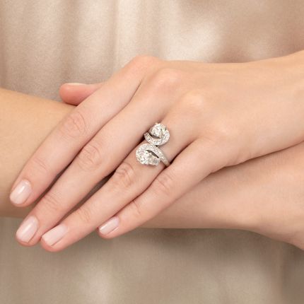 Toi et moi together forever and sparkling like the stars! This vintage 1950s toi et moi ring is a dazzling doozy. Curling platinum 'ribbons' set with scintillating single-cut diamonds bypass each other with a graceful curve, both culminating in a bright .95 carat European-cut diamond and a pair of flashing baguettes. A sparkling and captivating constellation for your finger. Total diamond weight, 2.70 carats. Hand fabricated, it is currently ring size 6 1/2. GIA Diamond Grading Reports for the two large diamonds state: I color, SI2 clarity and I color, SI1 clarity.